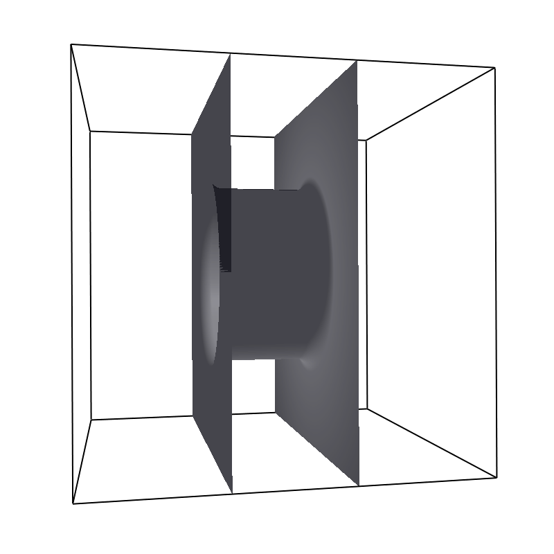To avoid unexpected behavior, make sure all parts of your shape are within the central box since the distance to the shape is calculated only within the central box. If parts of the shape are placed outside of the central box, these parts are truncated by the box boundaries. This may be desired as for example in the case of a cylinder shape whose end caps could extend outside the box boundaries to create an infinite rod.