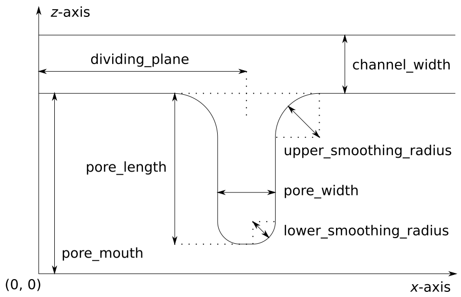 The parameters pore_mouth and dividing_plane specify the location in the z-coordinate resp. x-coordinate of the pore opening.
